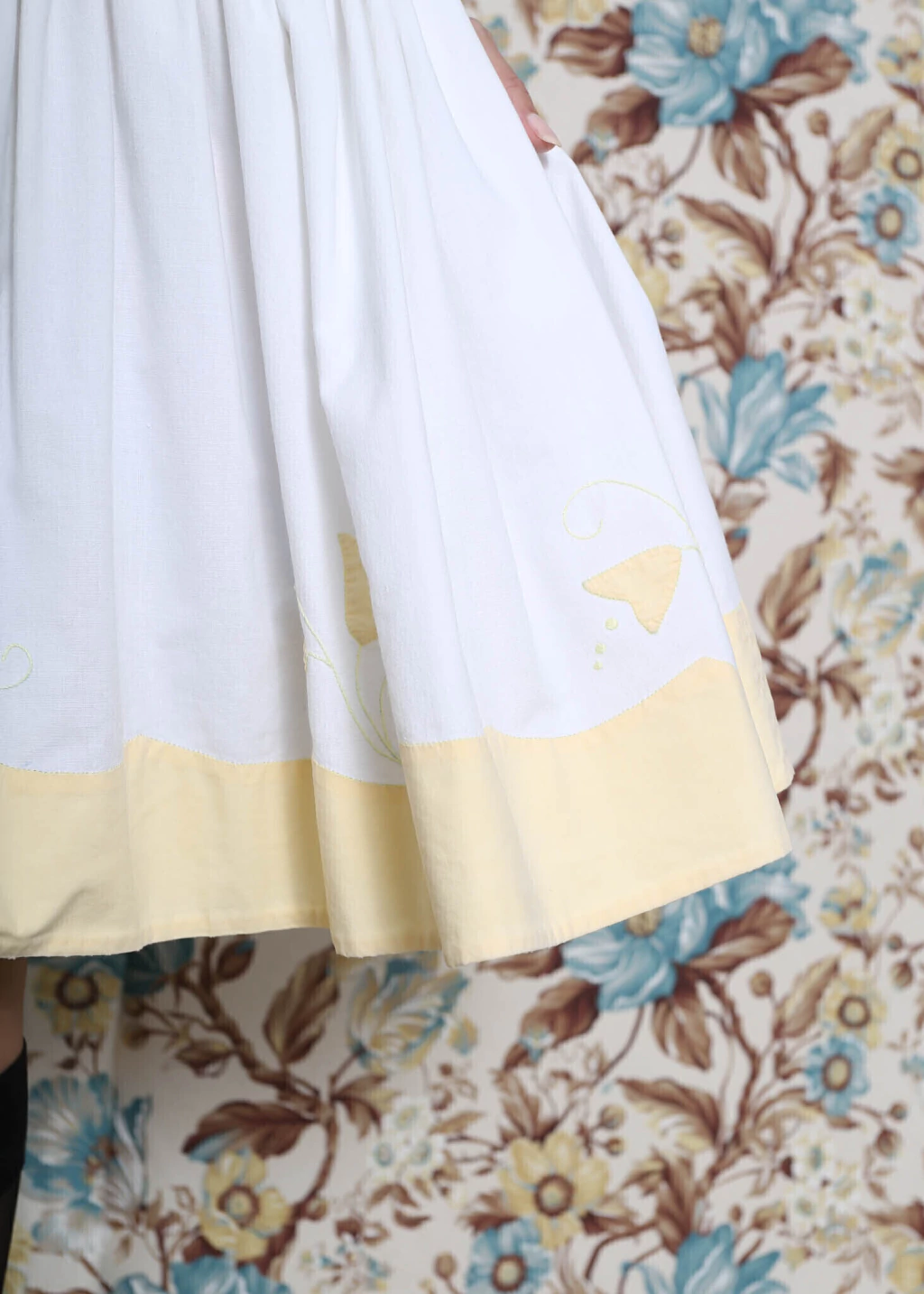 Vestido feito em tecido de algodão bem leve bordado manualmete com bolso frontal, original dos anos 60. Parte da saia feita em tecido de algodão bordado, original dos anos 50/60. Alça. costas em algodão com bordado floral. Possui bolsos laterais.